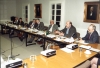 Konstituierende Sitzung des Beirats Niederdeutsch beim Schleswig-Holsteinischen Landtag, Abgeordnete und Fachleute tagen am runden Tisch, SSW-Abgeordneter Karl Otto Meyer, SPD-Abgeordnete Gyde Köster, CDU-Abgeordneter Fritz Latendorf, unbekannter Herr, Schulleiter Hans Ahrenstorf, Prof. Hubertus Menke von der Chritian-Albechts-Universität, Leiter der Kulturstiftung des Kreises Schleswig-Flensburg Henning Bachmann (von links nach rechts)