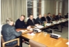 Konstituierende Sitzung des Beirats Niederdeutsch beim Schleswig-Holsteinischen Landtag, Abgeordnete und Fachleute tagen am runden Tisch, der Vertreter des Kultusministeriums Jakob Schäfer (Seitenansicht), SPD-Abgeordneter Gerhard Poppendieker, CDU-Abgeordneter Hans-Klaus Solterbeck, SPD-Abgeordneter Heinz-Werner Arens, Grenzlandbeauftragter Kurt Schulz, der Vertreter des Schleswig-Holsteinischen Heimatbundes Willy Diercks, die niederdeutschen Autoren [Prof. Reimer Bull] und Irmgard Harder (von links nach rechts)