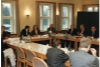 Sitzung des Beirats Niederdeutsch in der Heimvolkshochschule Leck, Leitung durch die Landtagspräsidentin Ute Erdsiek-Rave, Schulleiter Hans Ahrenstorf, SPD-Abgeordneter Gerhard Poppendiecker, unbekannter Herr, Landtagspräsidentin Ute Erdsiek-Rave, SPD-Abgeordneter Günter Fleskes , Grenzlandbeauftragter Kurt Schulz, Vertreter des Kultusministeriums Jakob Schäfer, CDU-Abgeordneter Hans-Klaus Solterbeck (von links nach rechts)