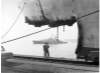 Nach Havarie zerstörtes Schiff "Regina D." am Kai, im Hintergrund das Kriegsschiff "Deutschland