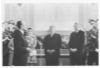 von links nach rechts: Frau Lemke[z.T. verdeckt], Schah Mohammed Reza Pahlawi, Kaiserin Farah Diba, Dolmetscher, Ministerpräsident Dr. Helmut Lemke, Stadtpräsident Werner Kock, Landtagspräsident Dr. Paul Rohloff [von Kock fast ganz verdeckt], Frau Rohloff [am Bildrand]